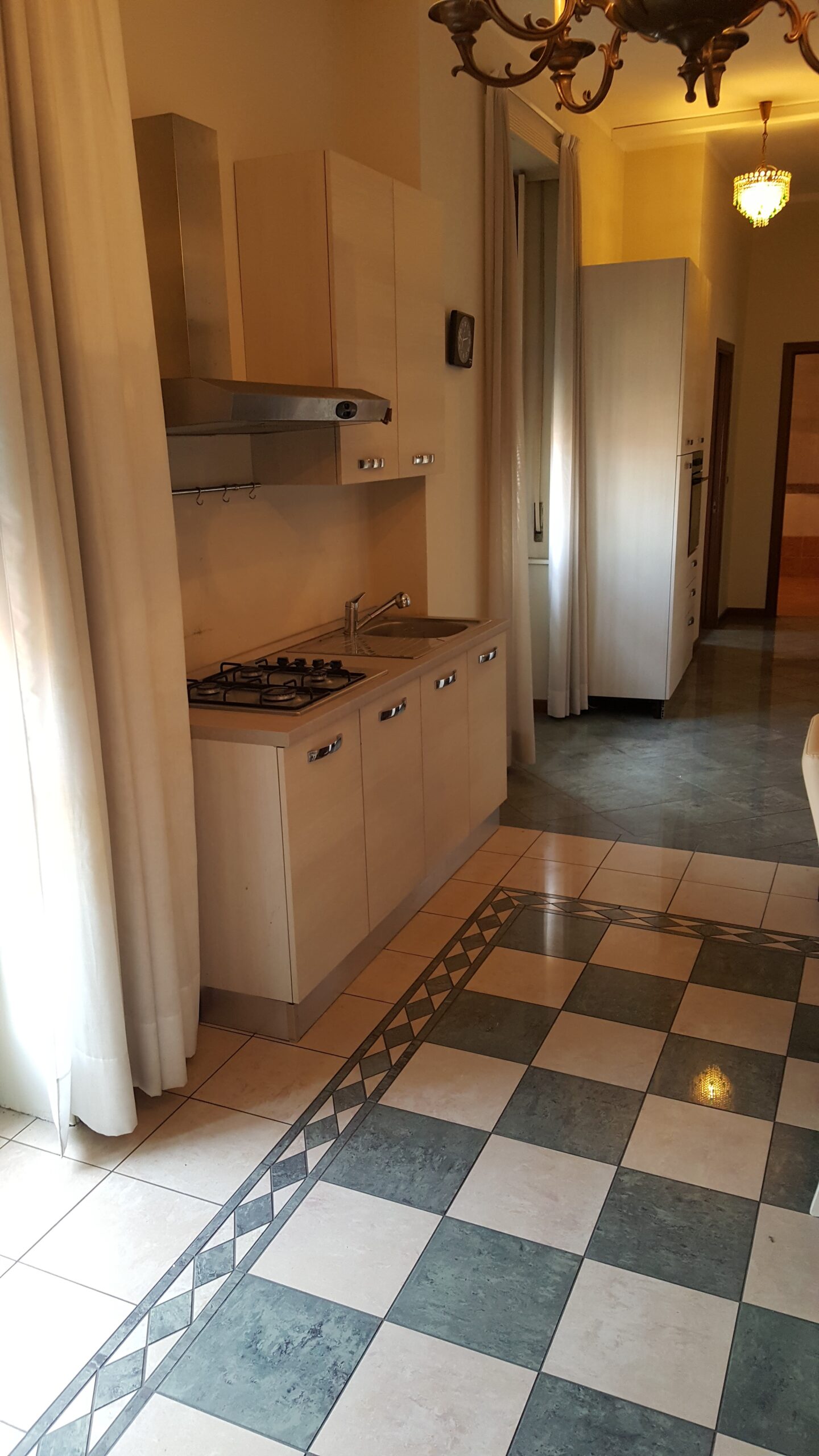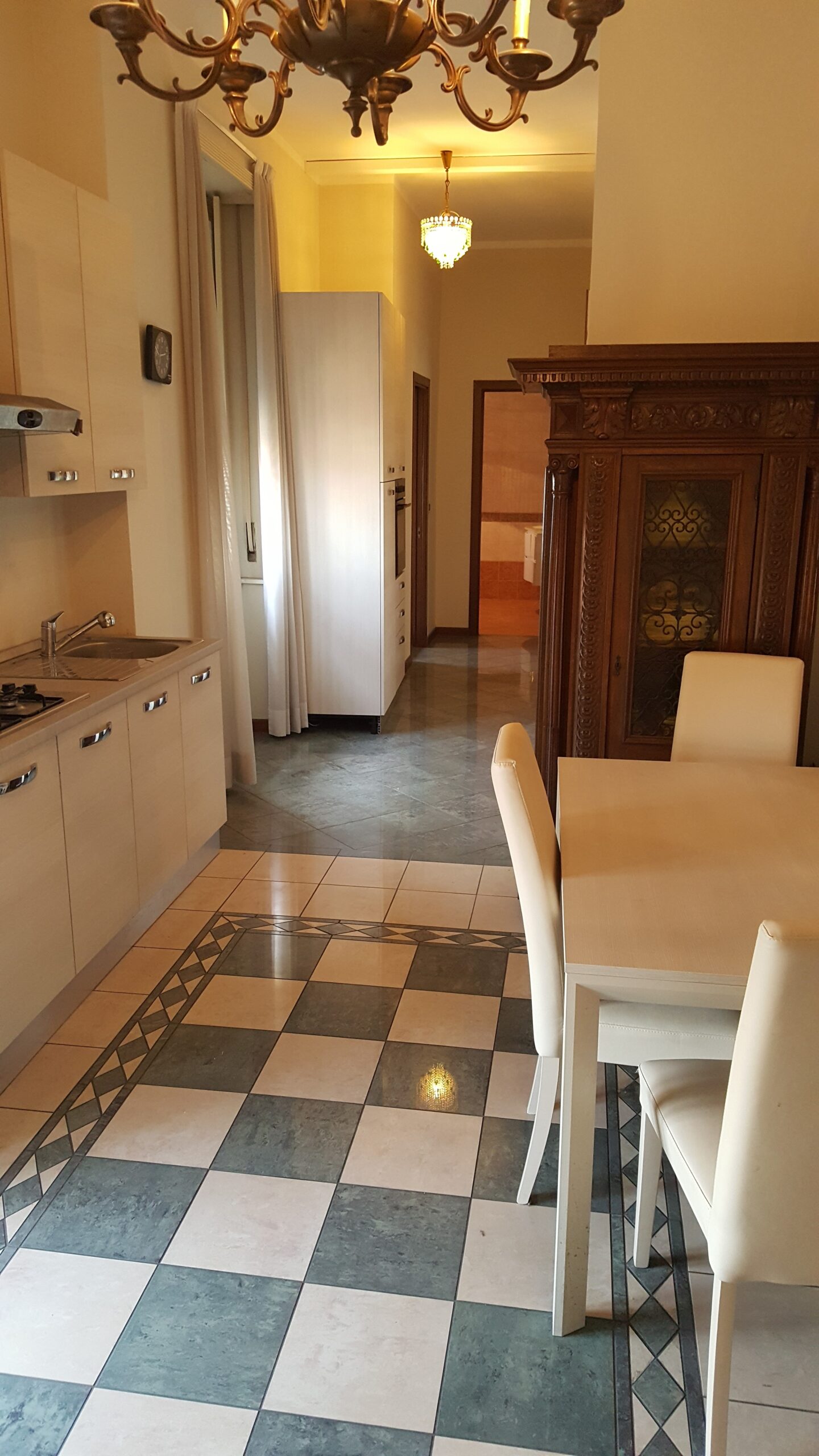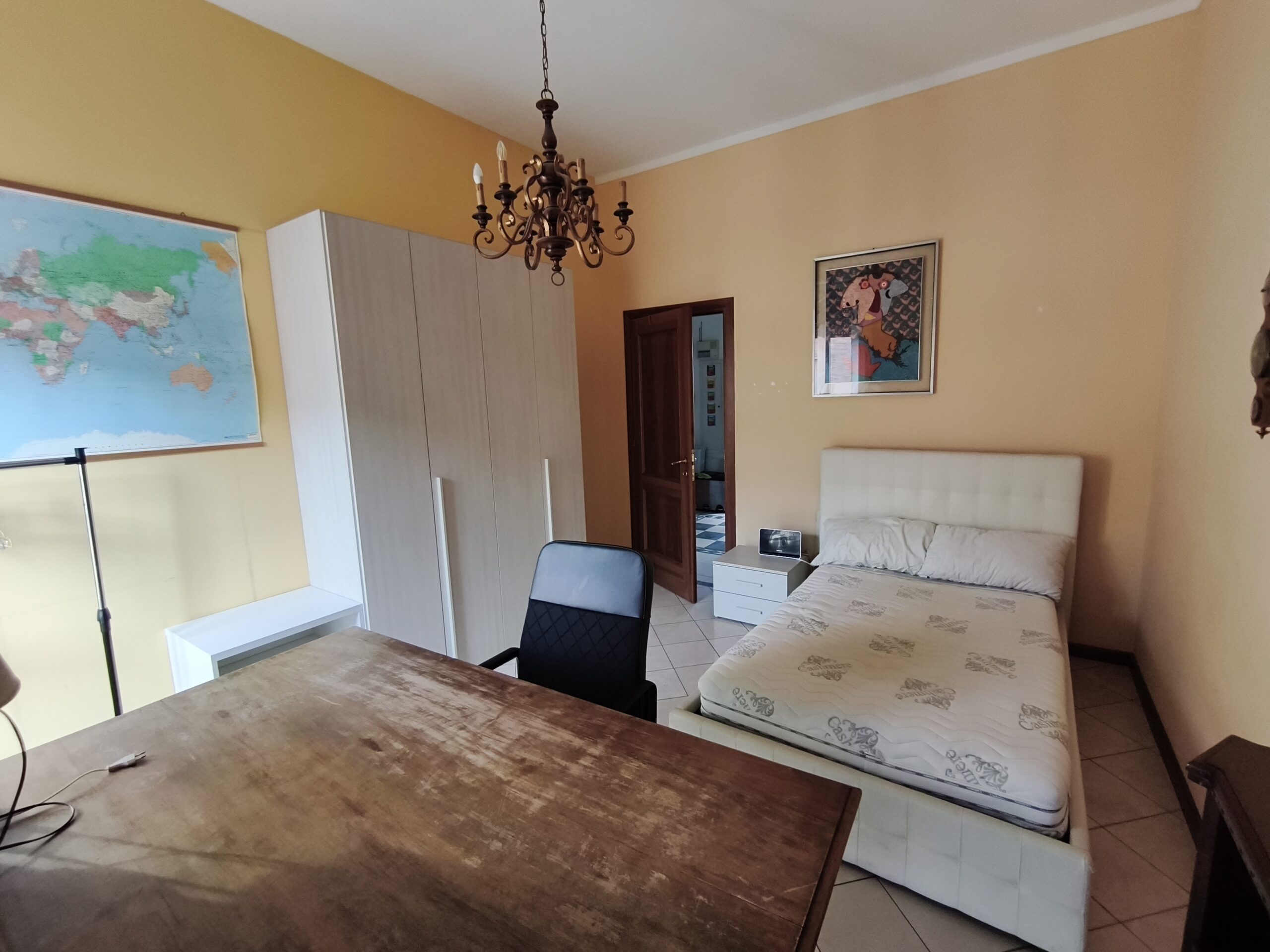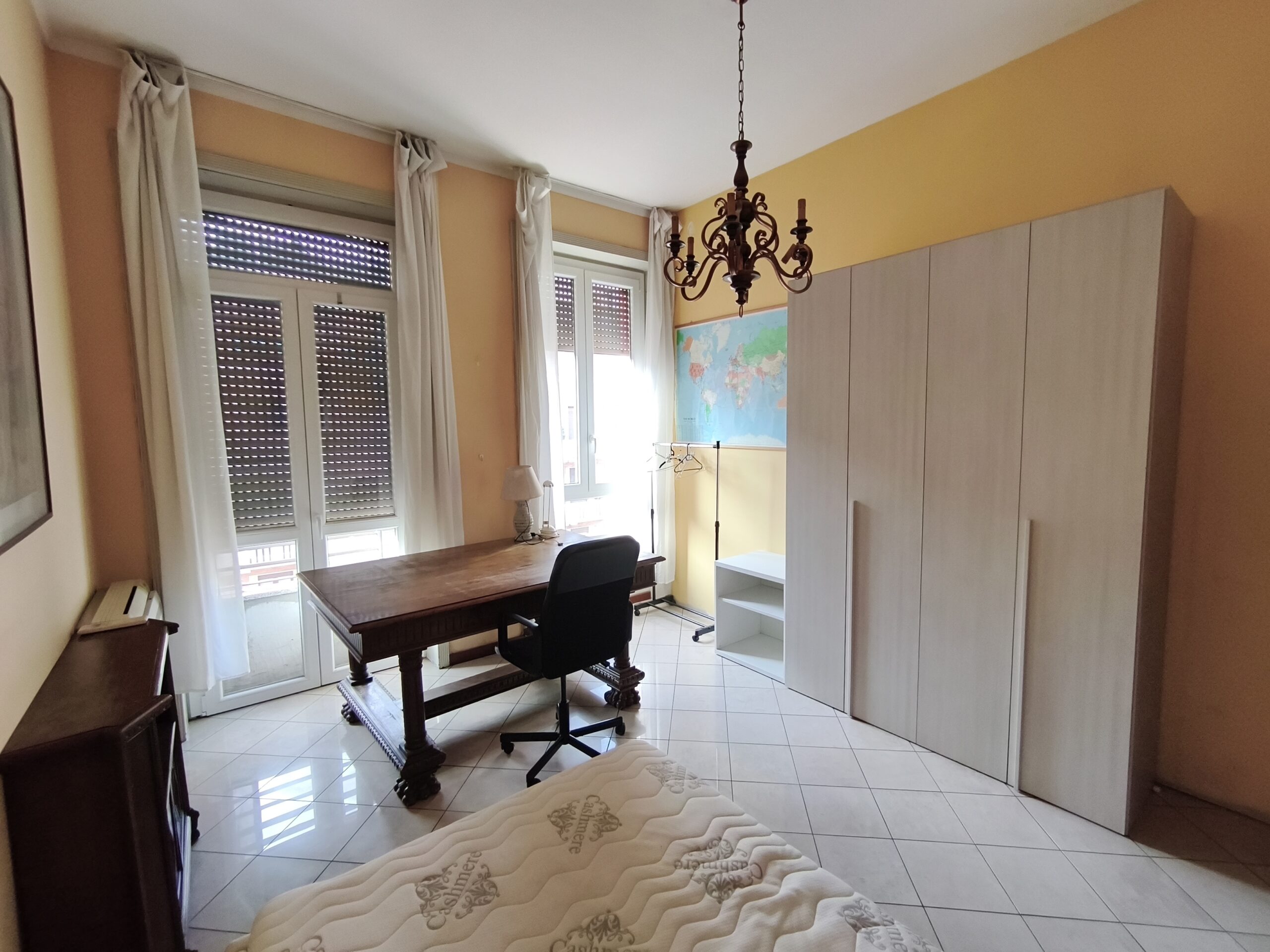 In stabile d’epoca con servizio di portineria, posto al 6 piano con ascensore, l’appartamento di mq 90 ha in condivisione solo il soggiorno con cucina a vista completamente attrezzata con tutti elettrodomestici compresa di lavatrice, 3 stanze in totale e due bagni.